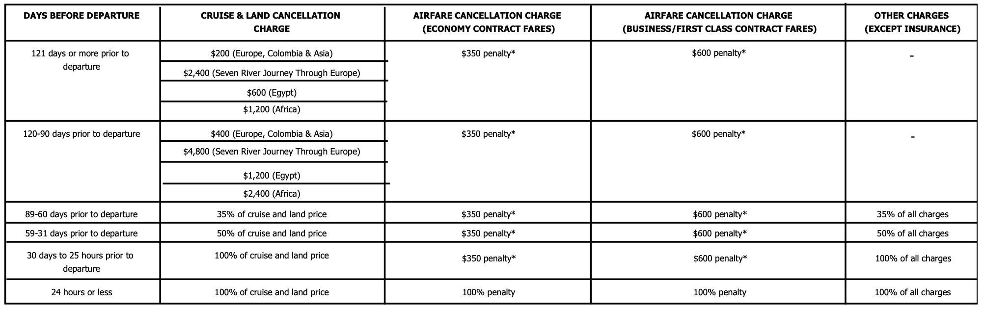 Additional cancellation penalties for special programs may be assessed in addition to the above; please see “Deposit and Final Payment” for more information. Cruise Protection Plan and Travel Waiver Plus premiums are non-refundable once purchased. Please note the above penalties are provided on a per person basis. *Airline cancellation charges imposed upon receipt of full payment of either airfare and/or river cruise relating to AmaWaterways air promotions , and if airline tickets have been issued. Certain international airline tickets, including published air tickets, may be 100% non-refundable and details will be advised at the time of booking. All intra-Europe, intra-Colombia, intra-Asia, intra-Africa and intra-Egypt flights, as well as Amman-Cairo and Cairo-Tel Aviv flights are non-refundable at the time of purchase. Except as otherwise provided in your Passenger Ticket Contract , after travel begins, there is no refund for unused services, or unused portions of cruise, land packages or airfare.